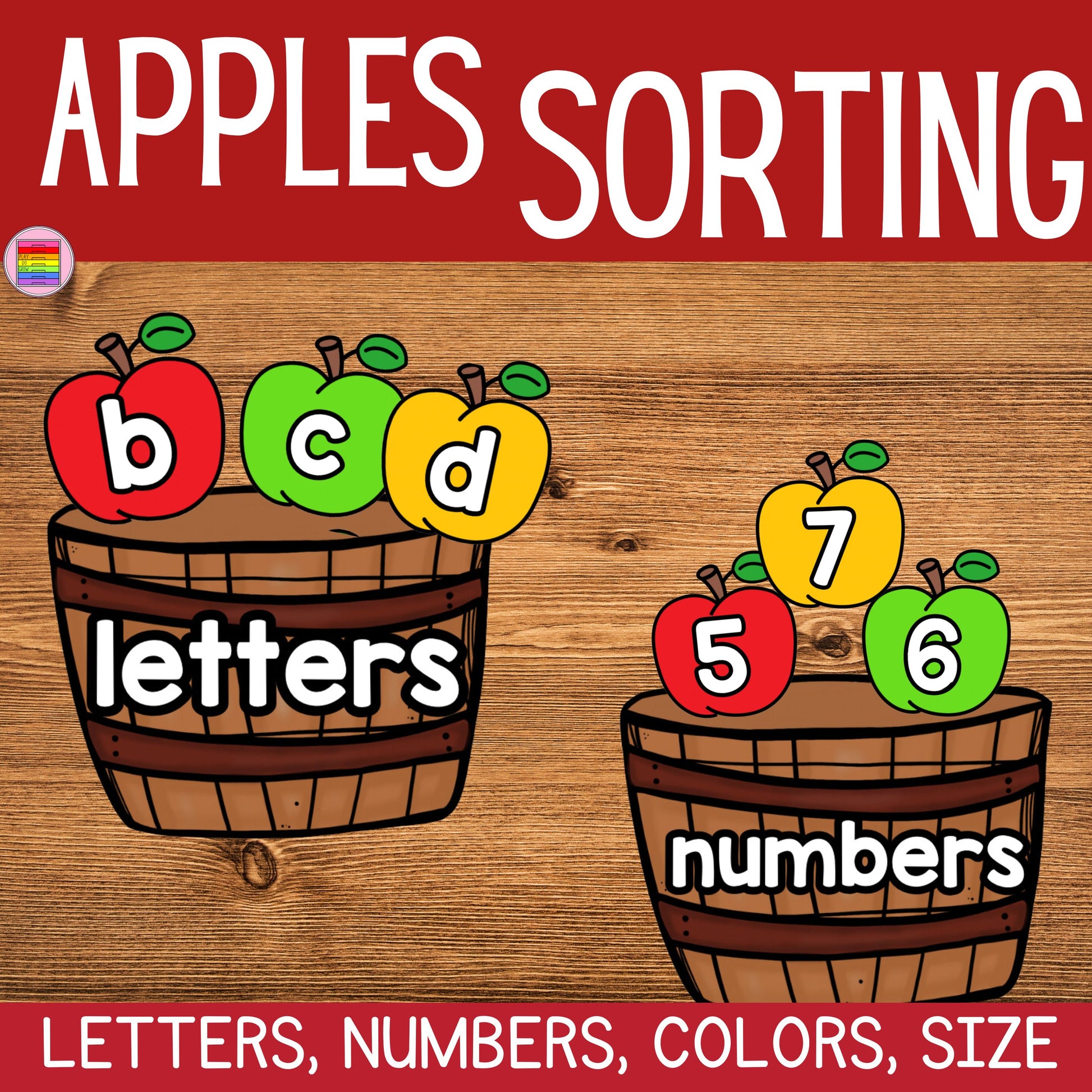 ⭐️INCLUDES: 12 Bushels with category name, 27 Big apples (red, yellow and green), 36 Medium apples (red, yellow and green), 27 Small apples (red, yellow and green), 26 Apples with letters, 26 Apples with numbers, 1 Color Sort and Graph mat, 1 Color Graphing Worksheet and 1 Black and White Graphing Worksheet