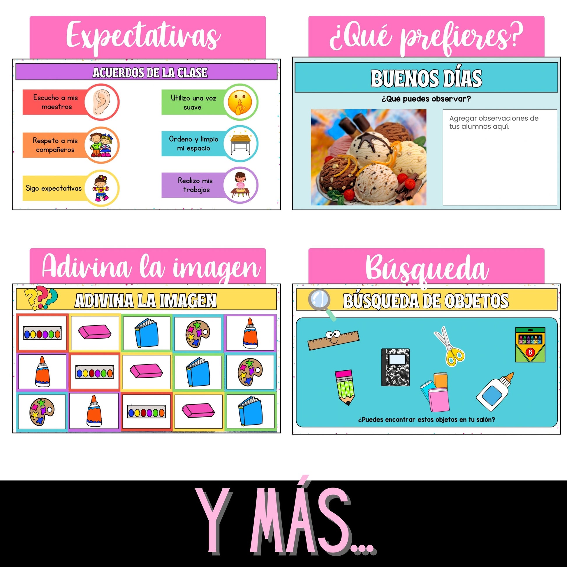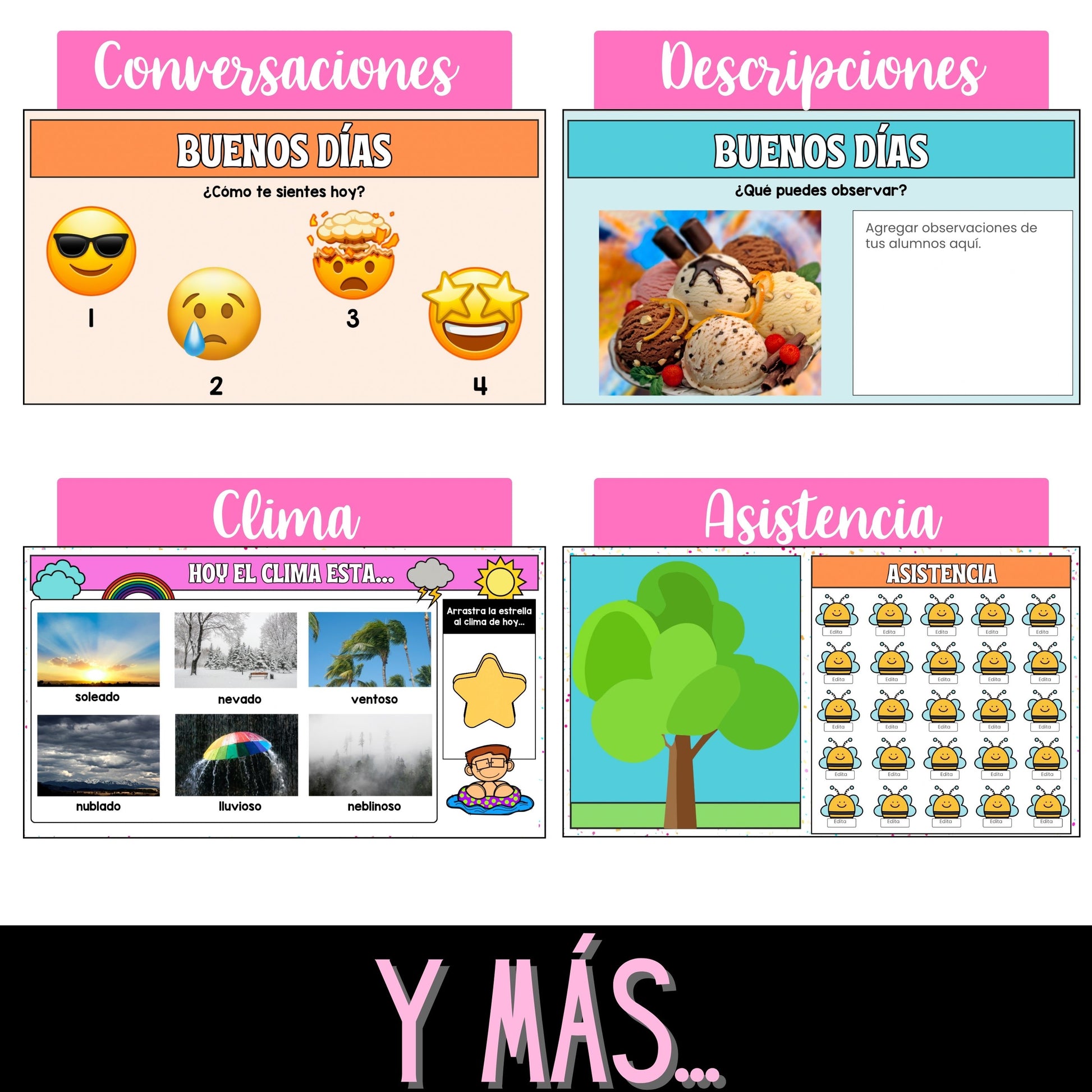 Comienza tu clase con una reunión de la mañana o trabajo grupal con estas diapositivas interactivas. Te dejo un preview de lo que podrás encontrar: